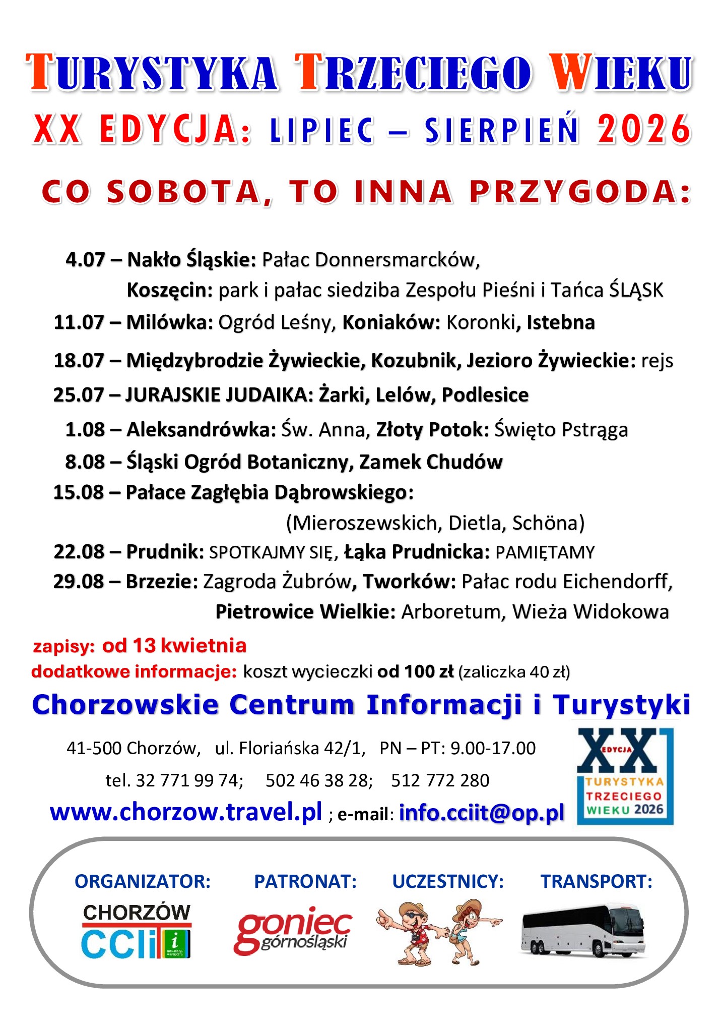 W związku z rozpoczętymi pracami drogowymi w Katowicach i zamknięciem przejazdu ul. Mikołowską, od 10 października wszystkie osoby biorące udział w wyjazdach turystycznych będziemy odbierać na początku ul. Piotra Skargi (przystanek autobusowy)